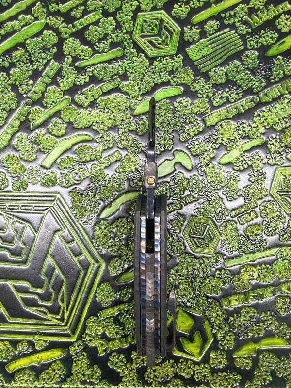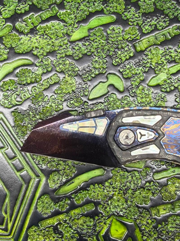 It's called the tank GUNDAM integral skills, titanium GRS Mother of Pearl, spacer, zirconium, scales, fat, carbon, black dunes, timascus Blade Damascus fractured open Length 150 MM closed length 95MM handle thickness 15 MM Blade thickness 4mm Cutting edge 65MM